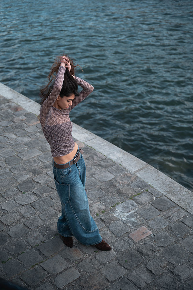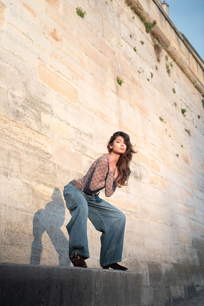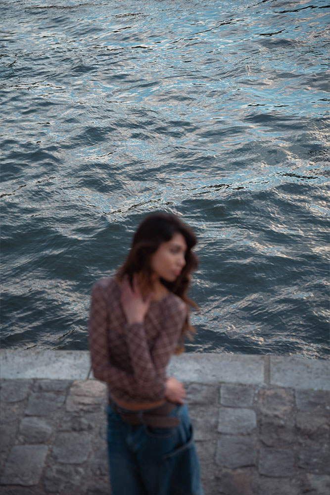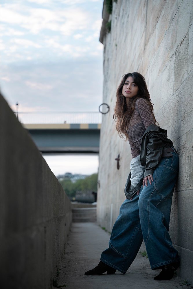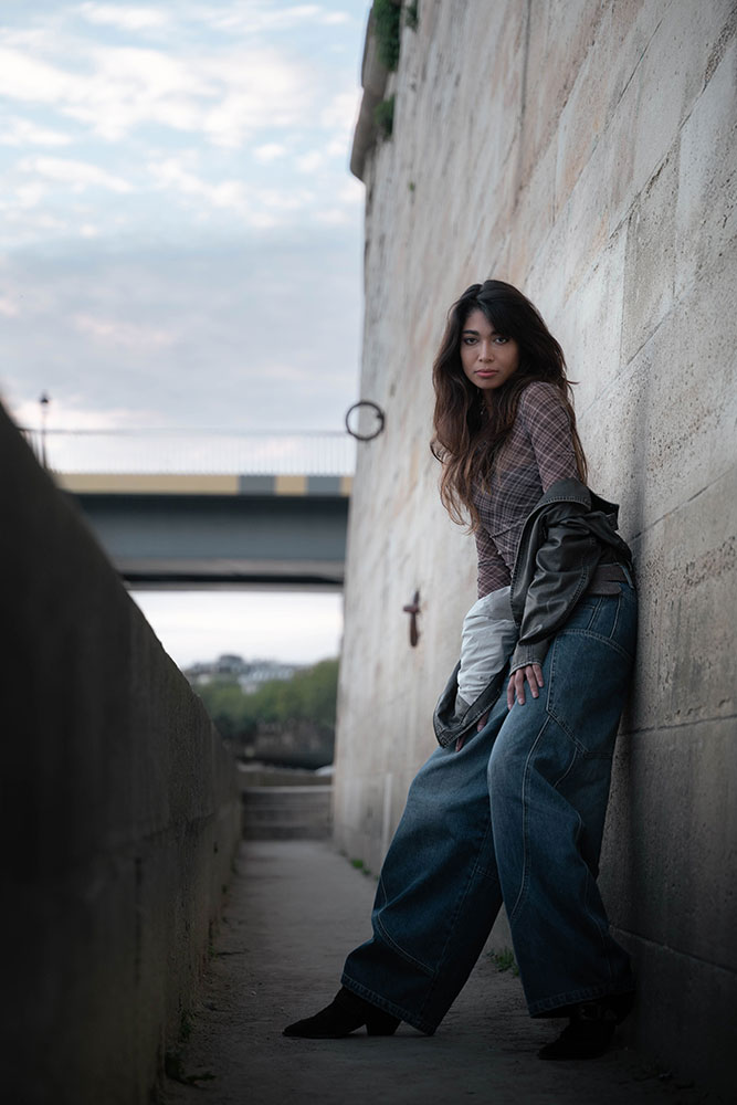 Zaha moved effortlessly between strength and softness, creating silhouettes against the fading light and intimate close-ups bathed in gold. The quais de Seine offered a perfect contrast: raw stone textures, fluid water, and that unmistakable Parisian atmosphere.